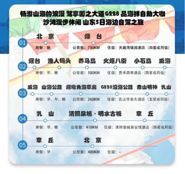 DAY 03威海-山海公路-烟墩角海草房-228国道沿海公路-赤山明神-乳山   260KM 餐:早、午、晚     住:乳山    酒店早餐后出发,一路沿千里山海公路行驶,一边欣赏美丽的海上风车阵,一边欣赏沿途山海美景。    随后抵达威海特有的烟墩角“海草房”。    打卡过后车队前往容城午餐,指定时间集合前往赤山景区游览参观,近距离欣赏世界最大锻铜神像、中国第一海神像--赤山明神。    游玩结束车队前往乳山入住酒店,稍事休息后晚餐。